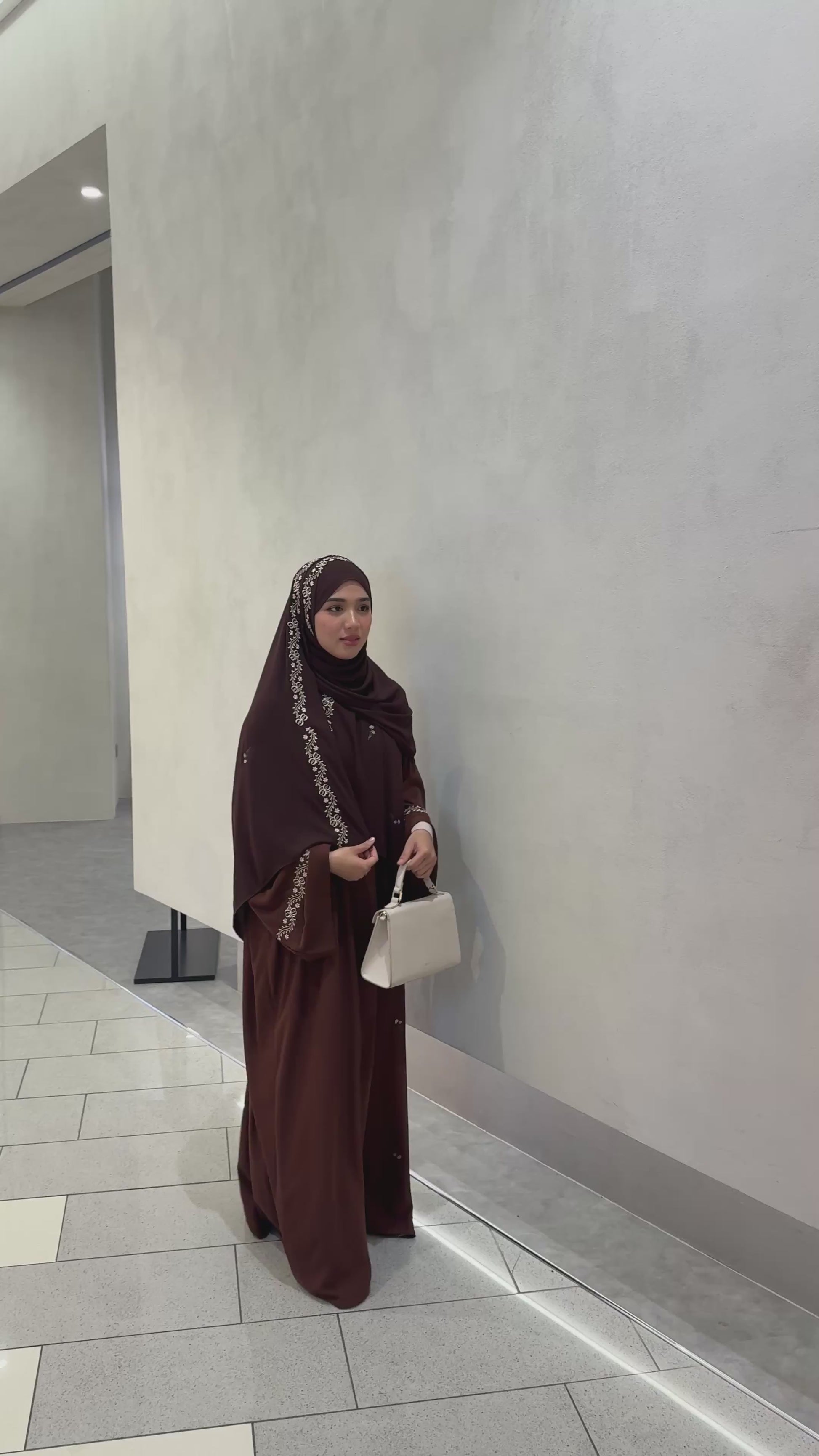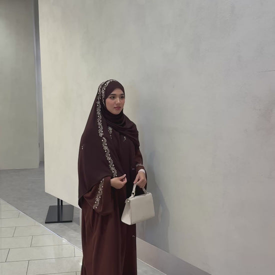 Each abaya is paired with a complimentary chiffon hijab finished with baby seams, creating a coordinated ensemble that embodies understated sophistication.